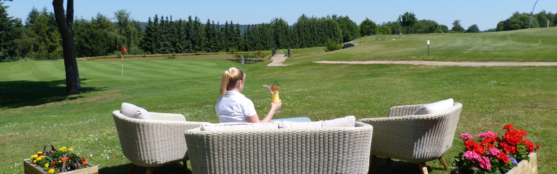 Genießen Sie auf unserer großzügigen Sonnenterrasse den Blick über das 18. Grün des Golfplatzes und lassen Sie sich von unserem aufmerksamen Service verwöhnen. Auch Nicht-Golfer sind herzlich willkommen – unsere Türen stehen allen offen, die gutes Essen und ein entspanntes Umfeld zu schätzen wissen.